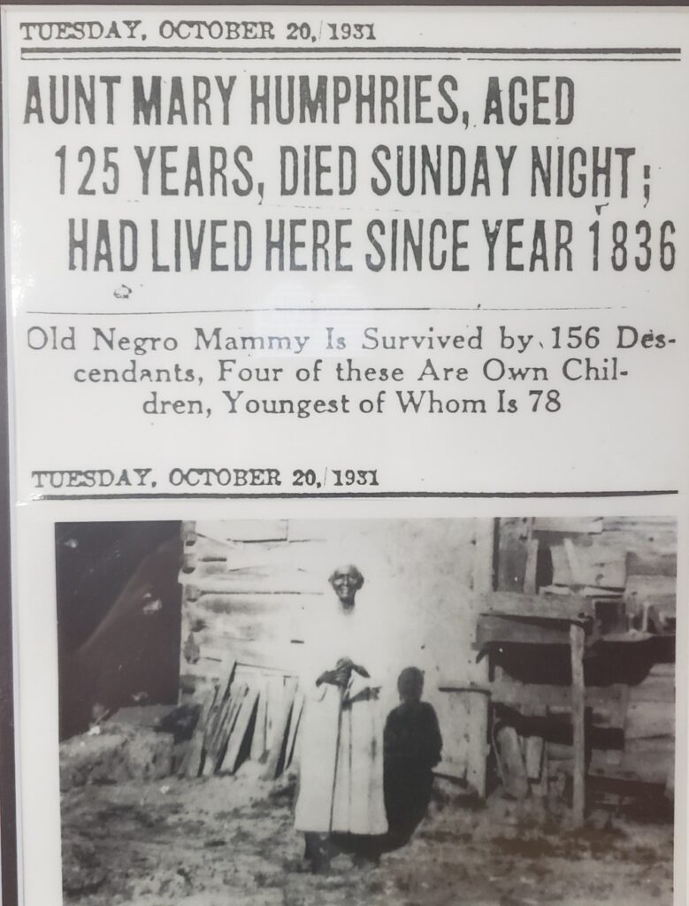 “Back to a time when a memory of a man runneth not to the contrary… such a statement can be made with almost certainty when referring to the life of Old Aunt Mary Humphries, who died at her home in the Dirgin community Sunday night.”